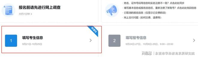 报名分为两个主要流程:填写考生信息+填写报考信息(考生信息可以在预报名前一周填写好,报考信息则是在预报名的时候才可以填写)