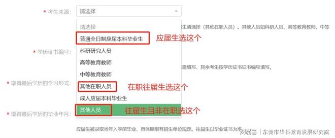 ③ 考生来源选择普通全日制应届本科毕业生,则取得最后学历的学习形式须是普通全日制。
