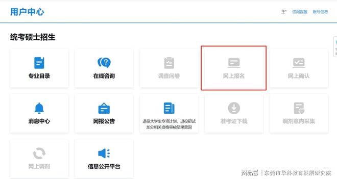 登录后选择【网上报名】进入报名界面。(预报名开启时这里会变成蓝色,可以点击)